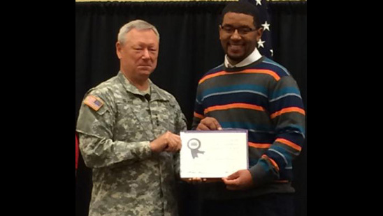 Tyrone Atkinson, program coordinator for Operation Military Kids at UK, received the Youth Development Volunteer Award from bureau chief Gen. Frank Grass at the National Volunteer Workshop in Oklahoma. Cindy Culver of the Boone National Guard Center in Frankfort nominated Atkinson.