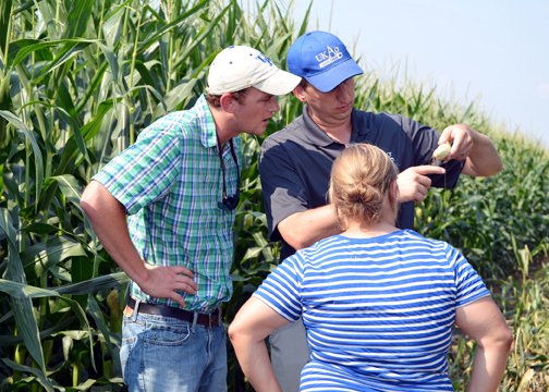 In addition to irrigation, their study will determine the plant’s nitrogen uptake and utilization. After producers made their regular nitrogen fertilizer applications this spring, Hagan and Settles measured a 30-by-50 foot strip in each field and made an additional nitrogen application when the crop reached around the V5 and V6 growth stages. Settles and Hagan collected plant tissue, soil fertility and nitrate samples from inside and outside the strip in each field before making the additional nitrogen application. They collected samples again at tasseling to determine if the late-season nitrogen application had any influence on the crop.