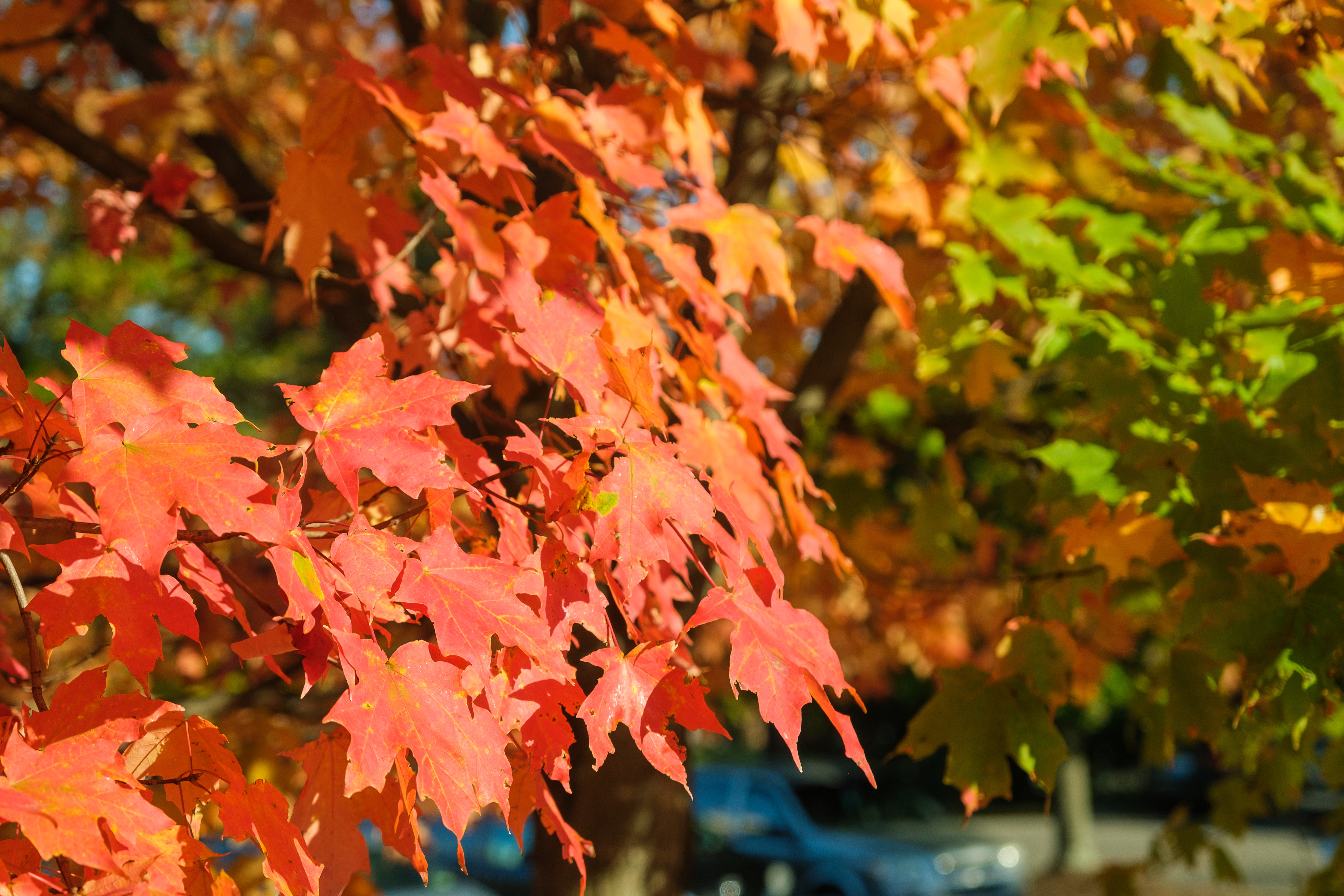 Carotenoids are responsible for giving the leaves their orange and yellow hues while the anthocyanin pigment is responsible for giving the leaves beautiful red, purple and crimson colors. Anthocyanin production increases dramatically in autumn, especially if the days are warm and sunny followed by cool nights.