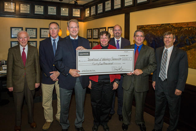 Representatives from Lloyd’s recently presented a check for $45,000 to UK, in continuing support of the Lloyd’s Equine Disease Quarterly, a research-based publication dedicated to equine health produced by the Department of Veterinary Science.
