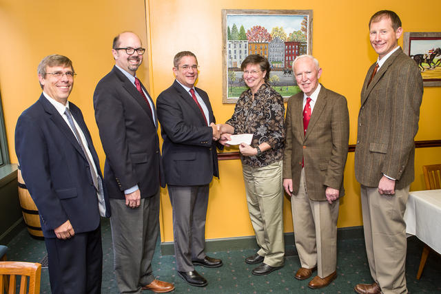Photo caption: Lloyd's of London presented a check for $50,000 to fund the Equine Disease Quarterly, published by the UK Department of Veterinary Science, Maxwell H. Gluck Equine Research Center. Lloyd's of London representatives (L to R): Ken Maier, Assistant V.P. Lloyd's Kentucky; William Wallace, V.P. Finance & Administration Lloyd's Kentucky; Pat Talley, Regional Director Central US Lloyd's America; and University of Kentucky College of Agriculture, Food and Environment rerpesentatives (L to R) Dr. Roberta Dwyer, Veterinary Science Faculty; Dr. Peter Timoney, Veterinary Science Faculty; and Dr. Alan Loynachan, Associate Professor Veterinary Diagnostic Laboratory.