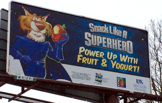 Billboards featuring a wildcat dressed as a super hero have popped up all over the state. The billboards are part of the U.S. Department of Agriculture’s “Snack Like A Superhero” promotion.