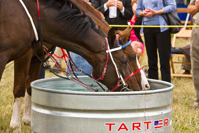 Even non-working horses will double their water intake during hot weather, so be sure plenty of water is available to horses in pastures, paddocks and stalls.