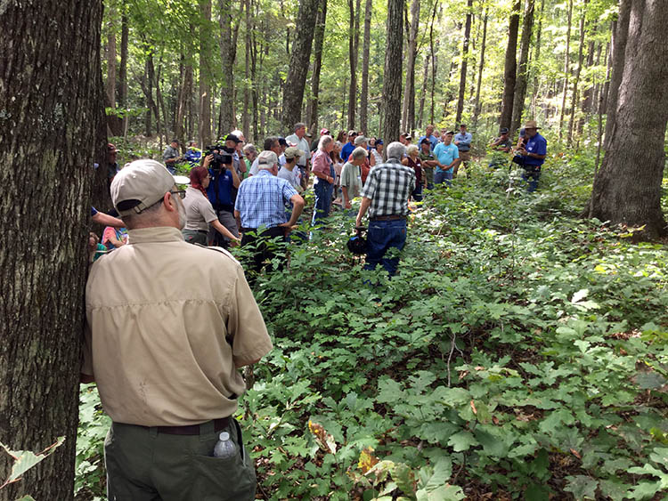 Up the hill, the group stopped at two stands where young white oaks were sprouting beneath an airy canopy of yellow poplar. Chris Will explained that proper management involves going out in advance of a harvest to make sure there are enough vigorous saplings of the desired species — in their case, white oak – to grow into the next forest after they harvest the mature saw timber trees.