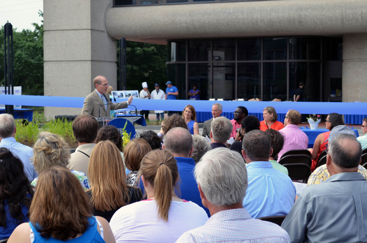 Fry told the gathered crowd that the plaza is now “a place that provides for outdoor classrooms, learning, socialization and research, with a meaningful investment in stewardship and greening our campus. It’s a place for large gatherings and for small, everyday conversations, a place to meet colleagues and make lifelong friends. It’s a place that celebrates the environment of education.”