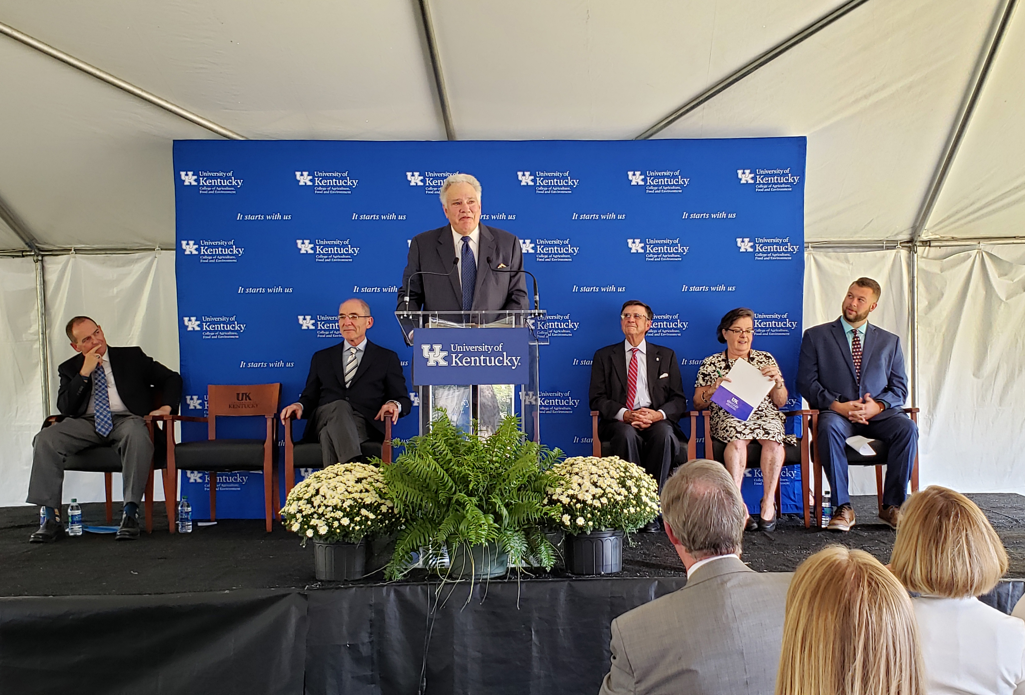 University officials gathered beside the historic Cooper House on Friday afternoon to celebrate its rebirth as the new front door for the College of Agriculture, Food and Environment and to recognize the establishment of the previously announced James B. Beam Institute for Kentucky Spirits, which will lay the educational foundation for the future of the Kentucky bourbon industry.