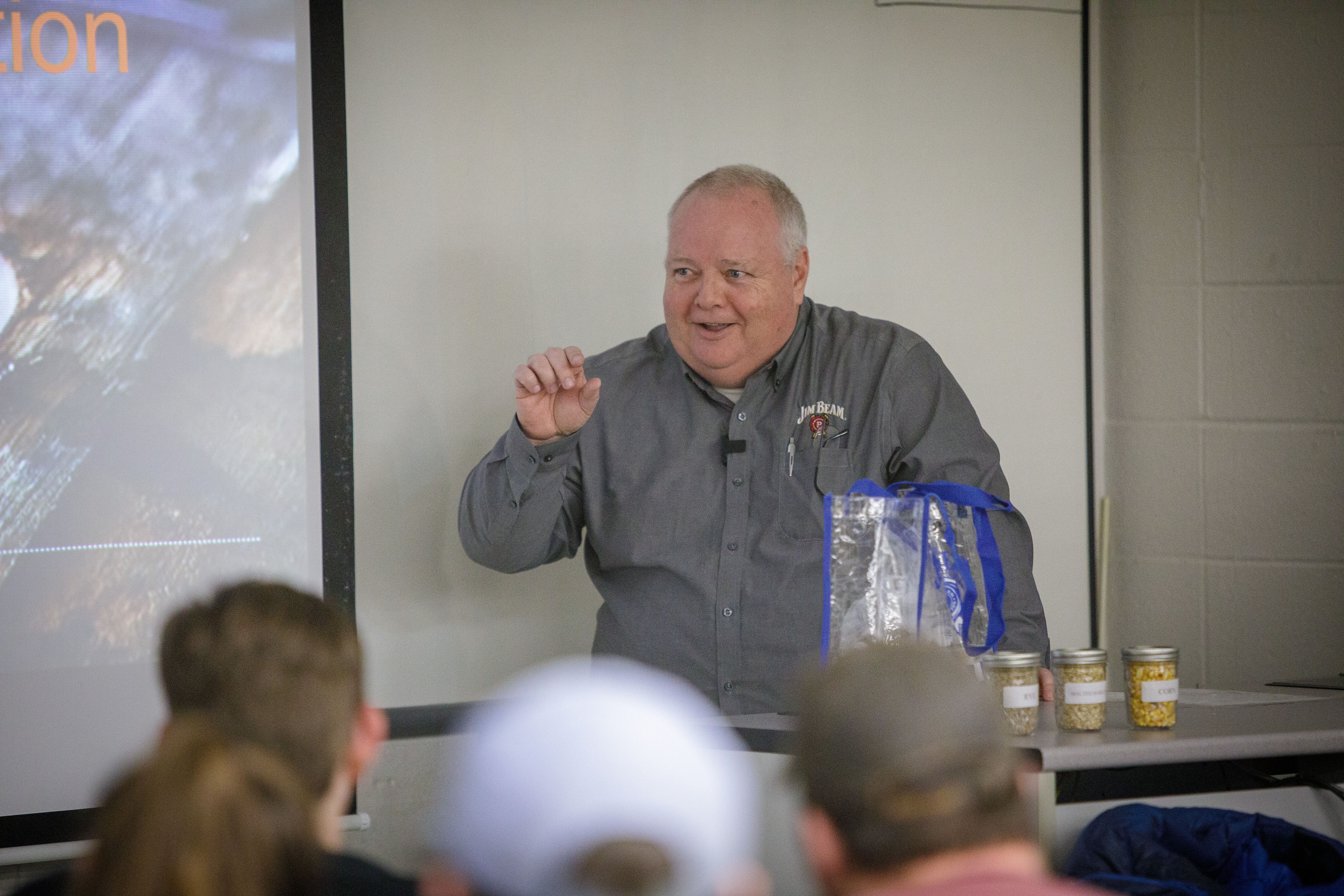 Students in the Distilling Studies certificate program listened as McGrew told stories of his years in the industry and passed around sniff samples so students could smell the difference between grain neutral spirits, new bourbon and aged bourbon. He also passed around common grains used in bourbon production — corn, rye and malted barley.