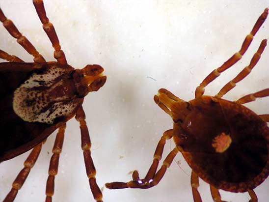 The two most common ticks found in the state are lone star tick and the American dog tick. The adult female lone star tick has a white spot on its back. The male is entirely reddish-brown. American dog ticks are reddish-brown with mottled white markings on their backs.