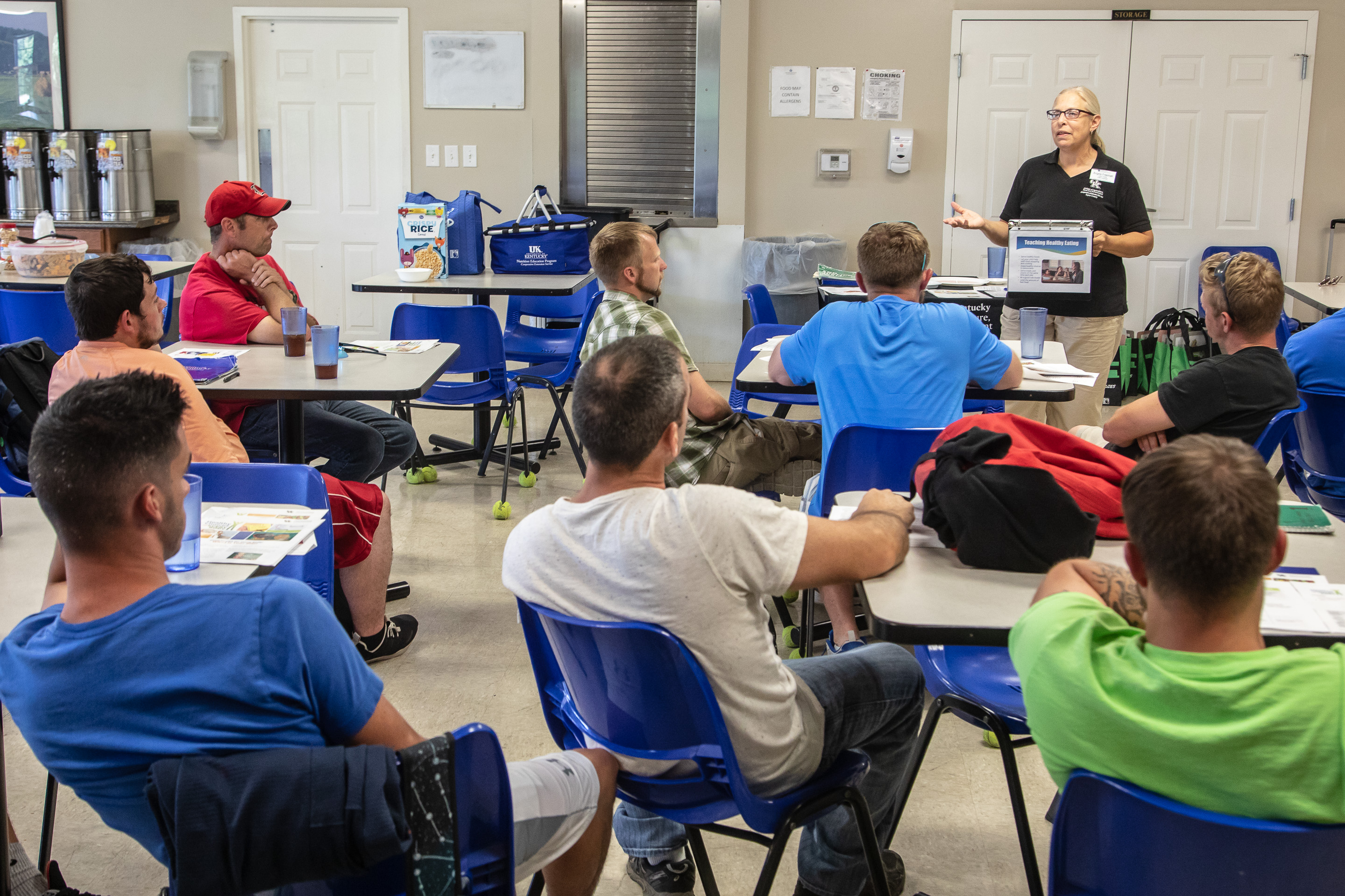 Angie Freeman, Taylor County program assistant with the Supplemental Nutrition Assistance Program-Education, offers nutrition education programs to clients at The Healing Place, an addiction recovery center in Campbellsville. She has led programs at the all-male treatment facility since 2013, presenting topics such as meal planning, MyPlate, food budgeting and food safety.
