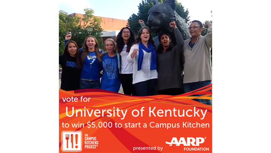 In October, students in the UK Department of Dietetics and Human Nutrition had one week to encourage supporters to vote daily for their video on the Campus Kitchens website http://www.campuskitchens.org/aarp. Of the five schools that participated, UK received the most votes. As a result, they received a $5,000 grant sponsored by AARP Foundation to start a kitchen.