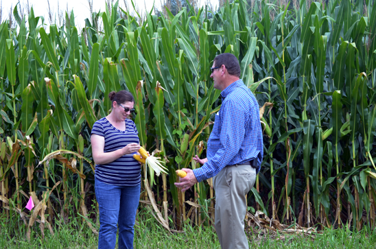 Carrie Knott, UK agronomist, is working with Muhlenberg County farmer Danny Miller and Darrell Simpson, UK Cooperative Extension Service agriculture and natural resources agent for Muhlenberg County, on a project that tests the feasibility of controlled drainage structures.