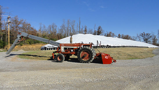 By installing commercially available metal walls with perforated sections for aeration, producers can create covered outdoor piles. McNeill recommends installing a well-packed surface with fine gravel and covering it with heavy plastic to provide a moisture barrier and facilitate unloading. Producers should have aeration tubes in place prior to filling and continue to install them as the pile grows.