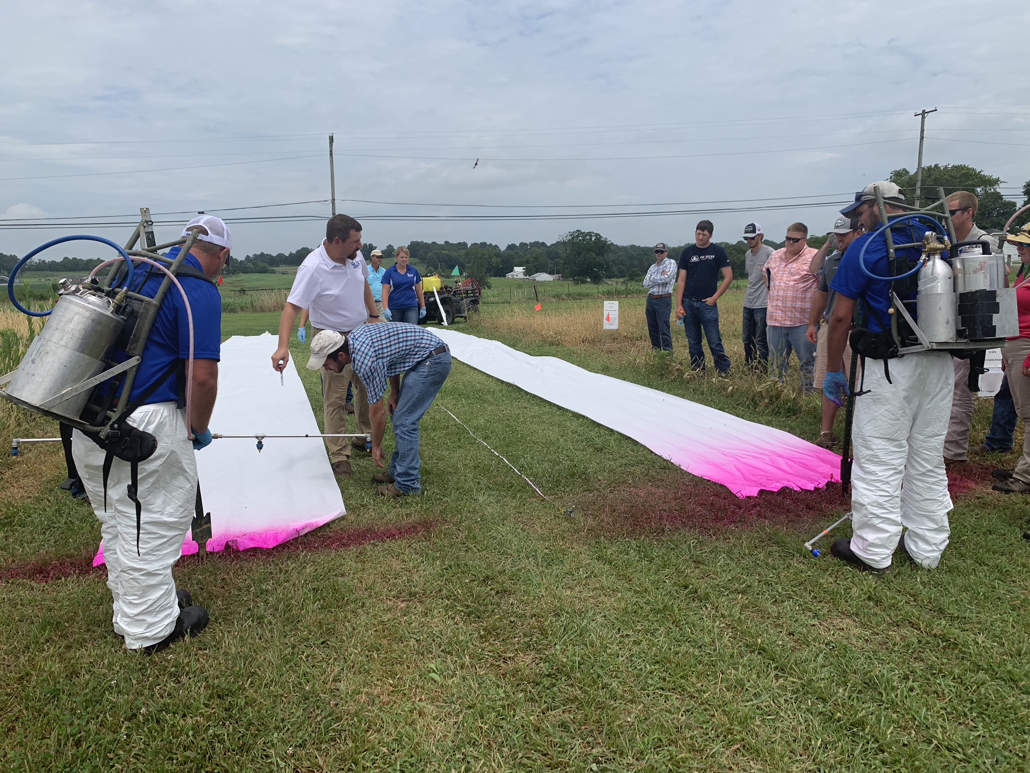 “We spend about 45 minutes with our spray table simply talking about droplet size, how to control droplet size and why it’s important for herbicide drift, he said. “We then go out to the plots and explain why droplet size and boom height are so critical in reducing drift using live demonstrations with bright pink dye that shows up on everything it touches downwind.”